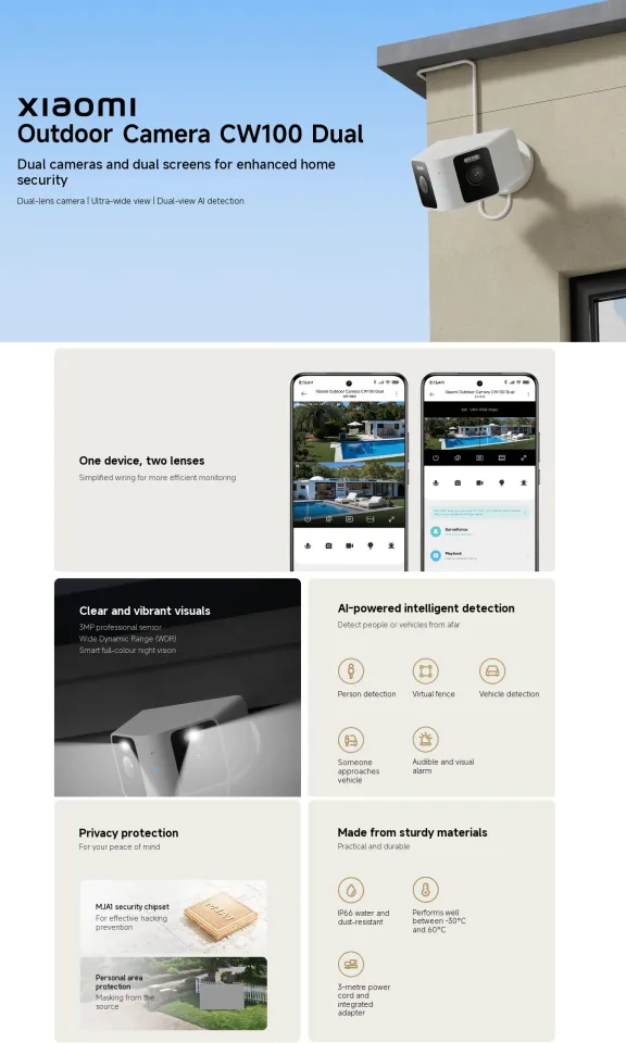 Xiaomi Outdoor Camera CW100 Dual je napredna vanjska sigurnosna kamera s dva objektiva koja omogućuje nadzor širokog kuta bez “mrtvih kutova” uz visoku 2K rezoluciju.