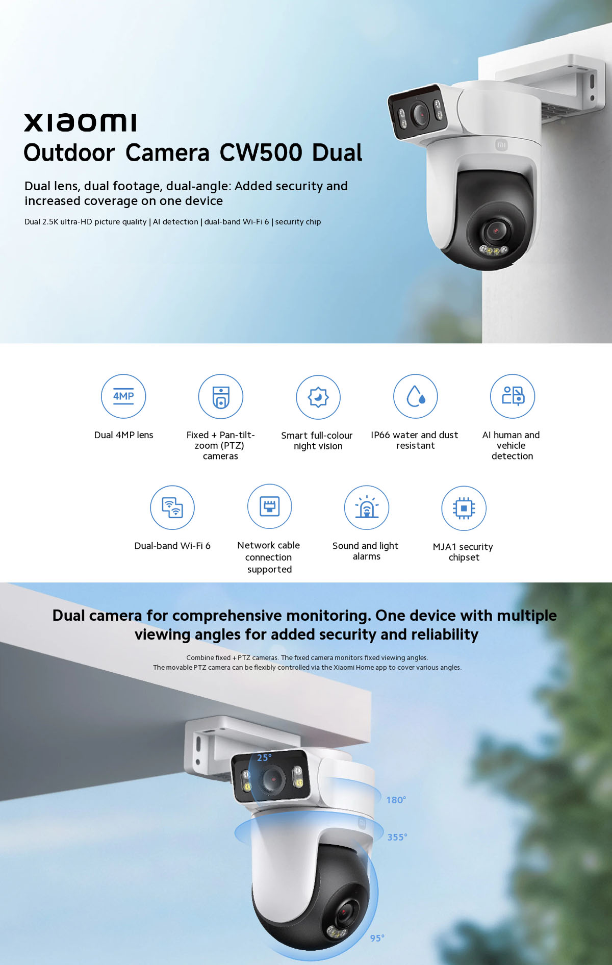 Xiaomi Outdoor Camera CW500 Dual je vanjska nadzorna kamera opremljena s dva objektiva od 4 MP koji pružaju 2.5K rezoluciju i pokrivenost od 360 stupnjeva. Kamera kombinira jednu fiksnu leću za stalni nadzor određenog kuta i jednu pokretnu PTZ (pan-tilt-zoom) leću kojom se upravlja putem aplikacije.